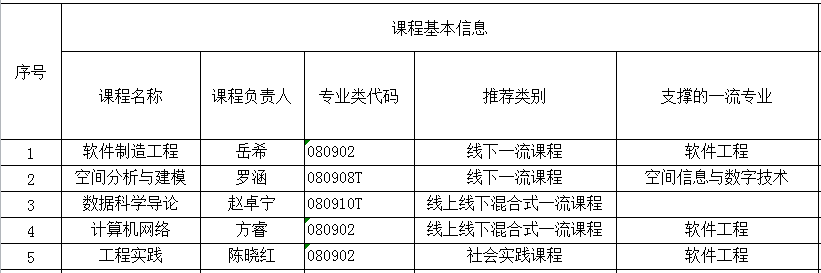 根据学校教务处发得“关于开展2020年省级线下、线上线下混合式、社会实践一流本科课程申报工作的通知”精神,我院推选《软件制造工程》等以下5门课程参加“省级一流本科课程申报”,特此公示。公示日期:2020年12月23日—12月25日,若学院教师对此次推选工作有异议的,请于公示期三日内联系金沙js4399首页教务科黄健,电话85966923。